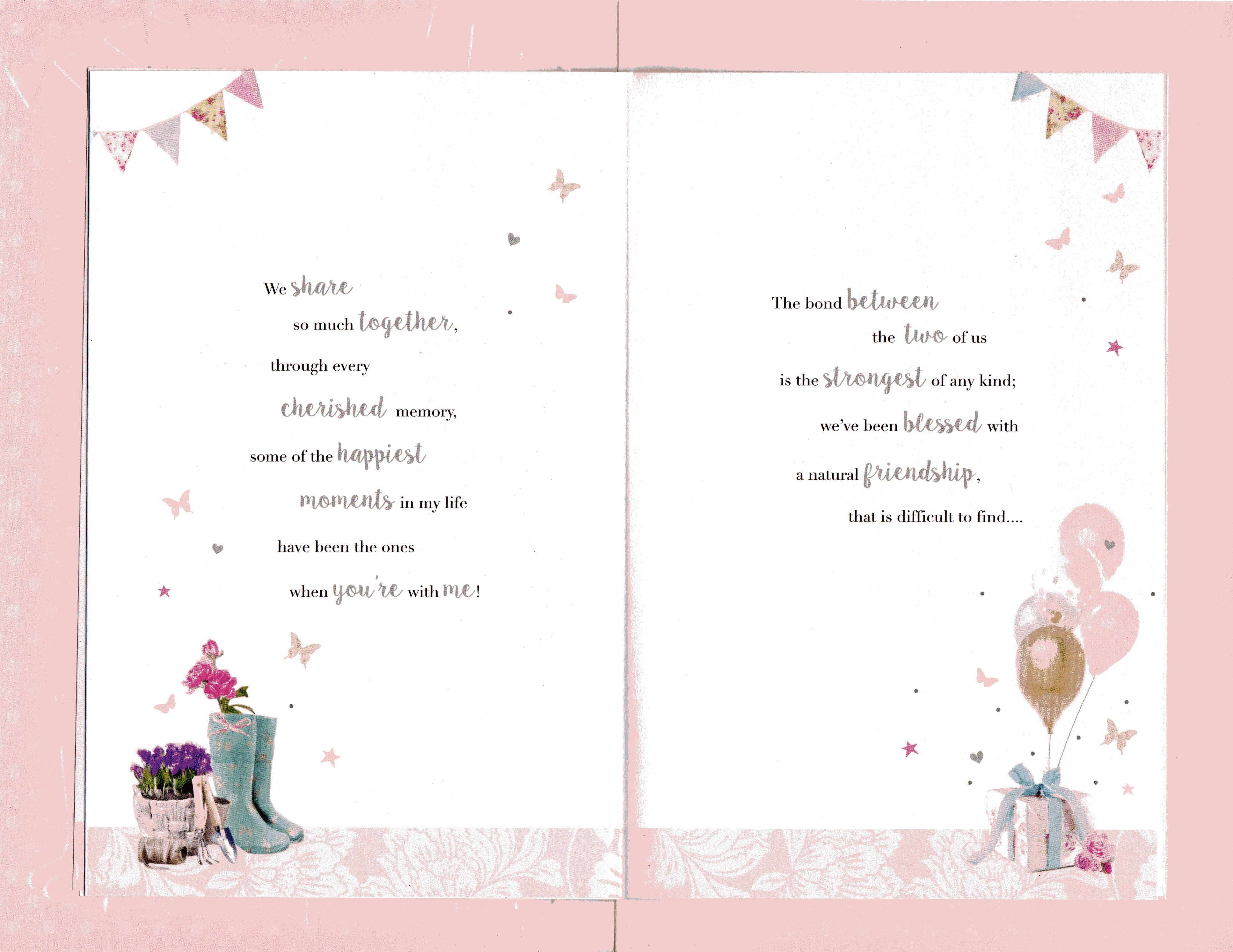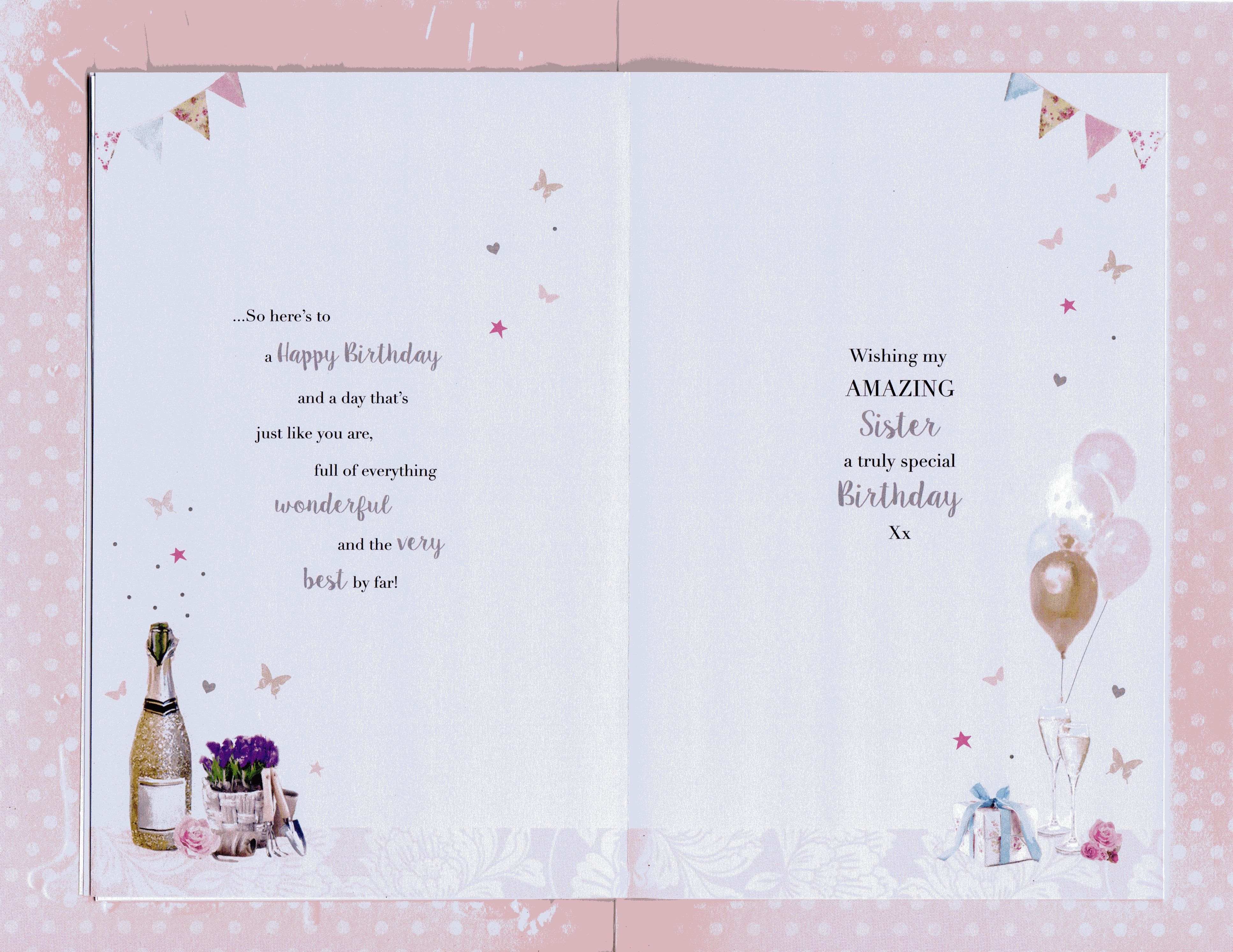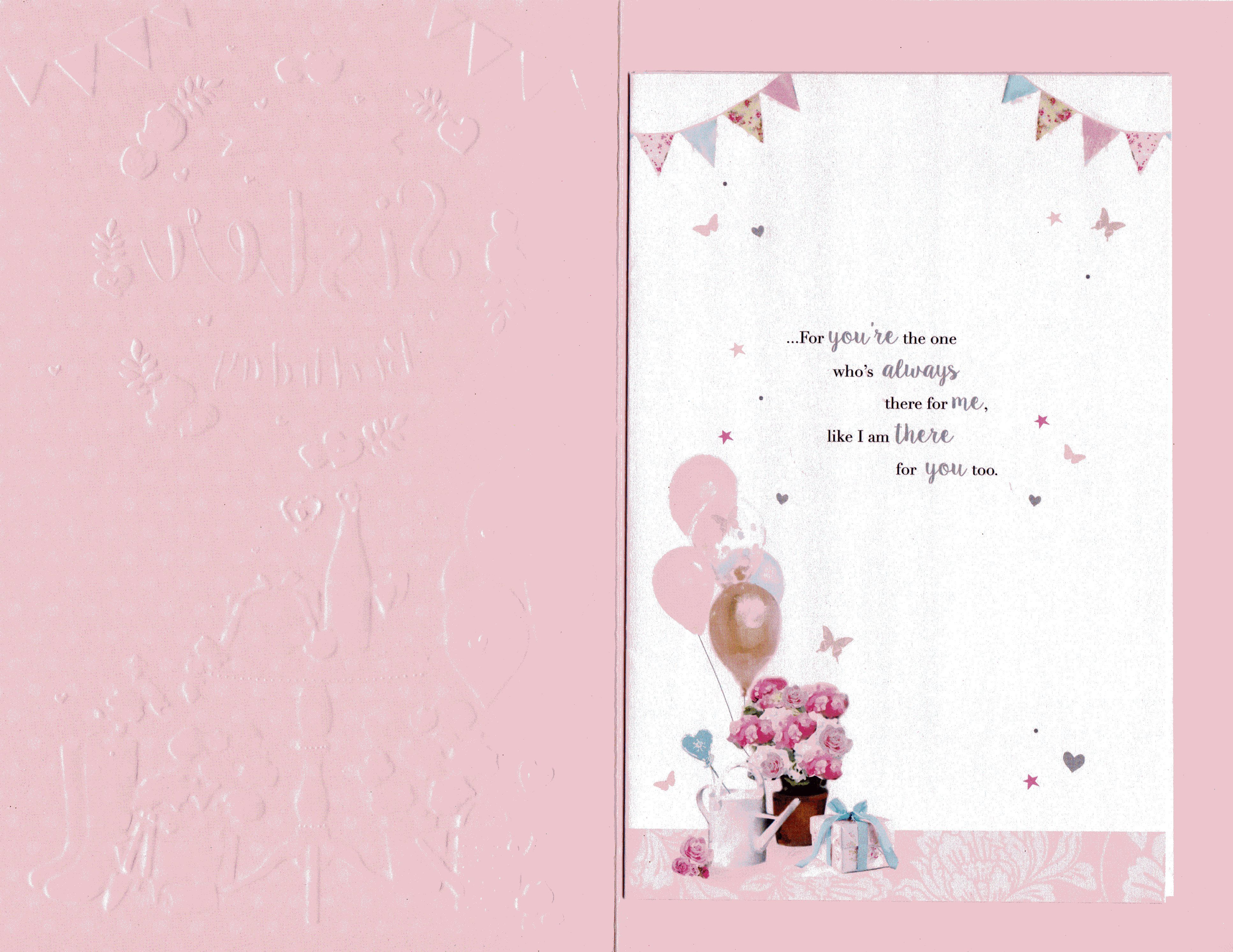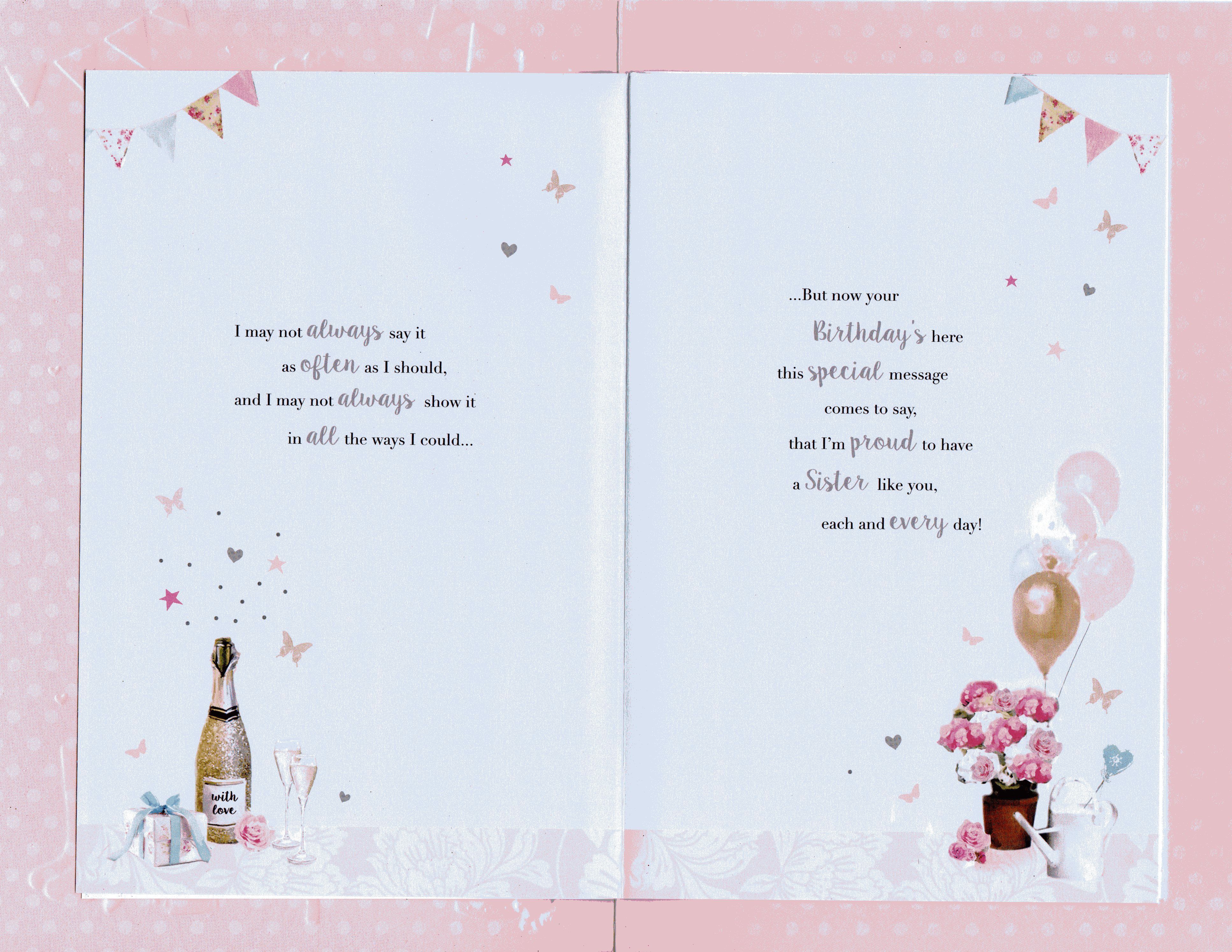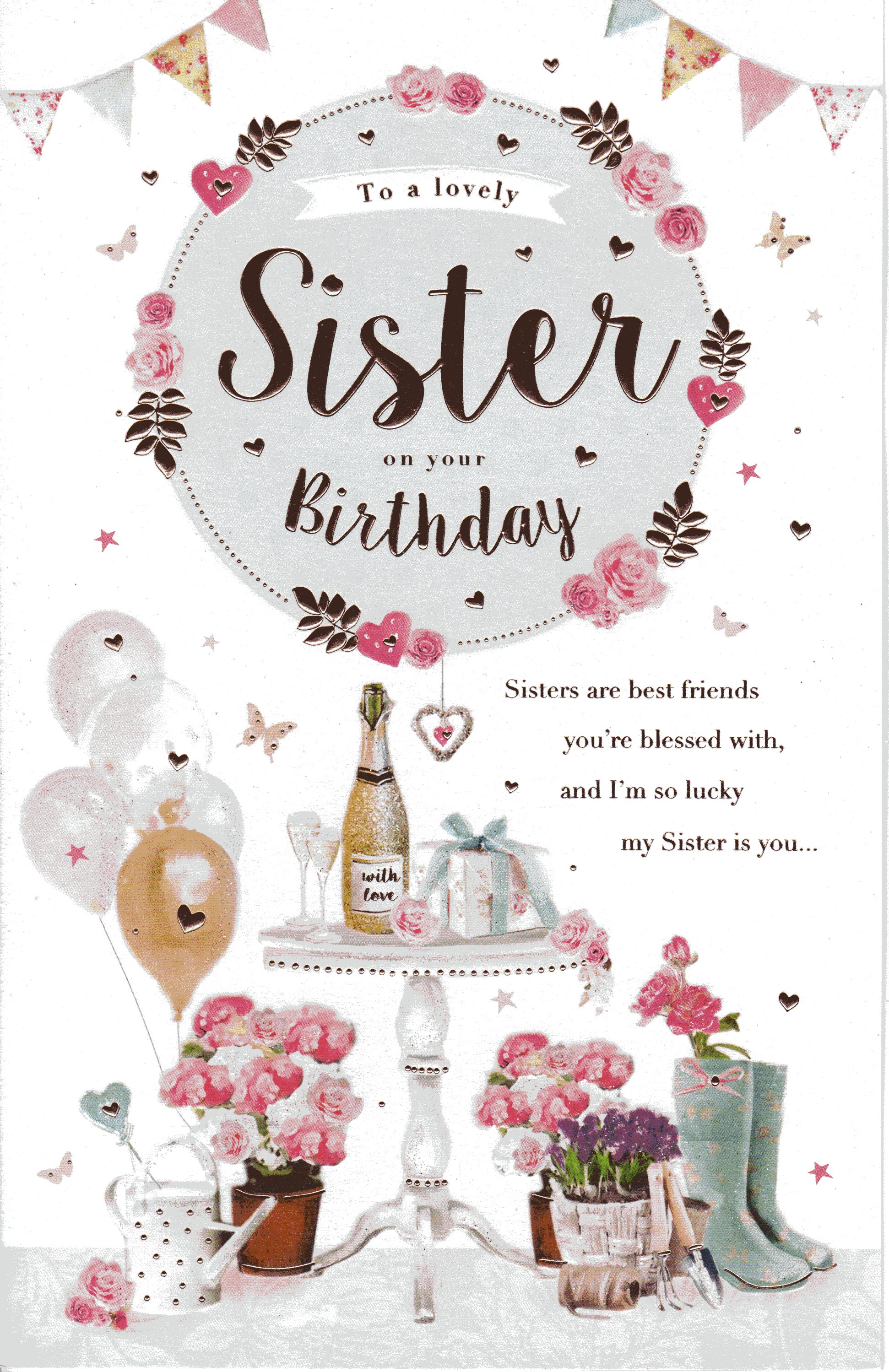 On the front the card reads: To a lovely Sister on your Birthday Sister are best friends you're blessed with, and I'm so lucky my Sister is you...