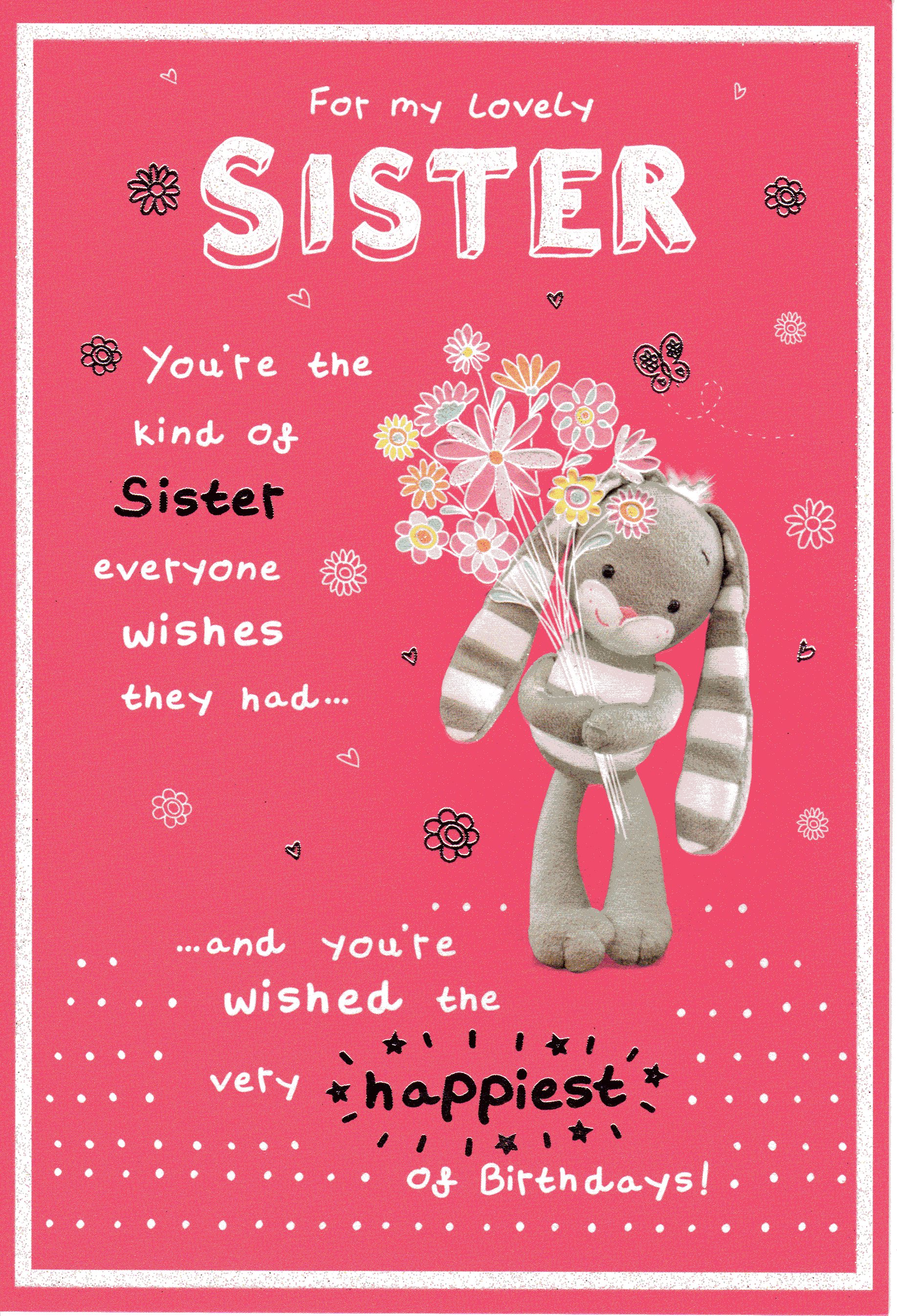 On the front the card reads: For my lovely Sister you're the kind of Sister everyone wishes they had..., ...and you're wished the very happiest of Birthday!