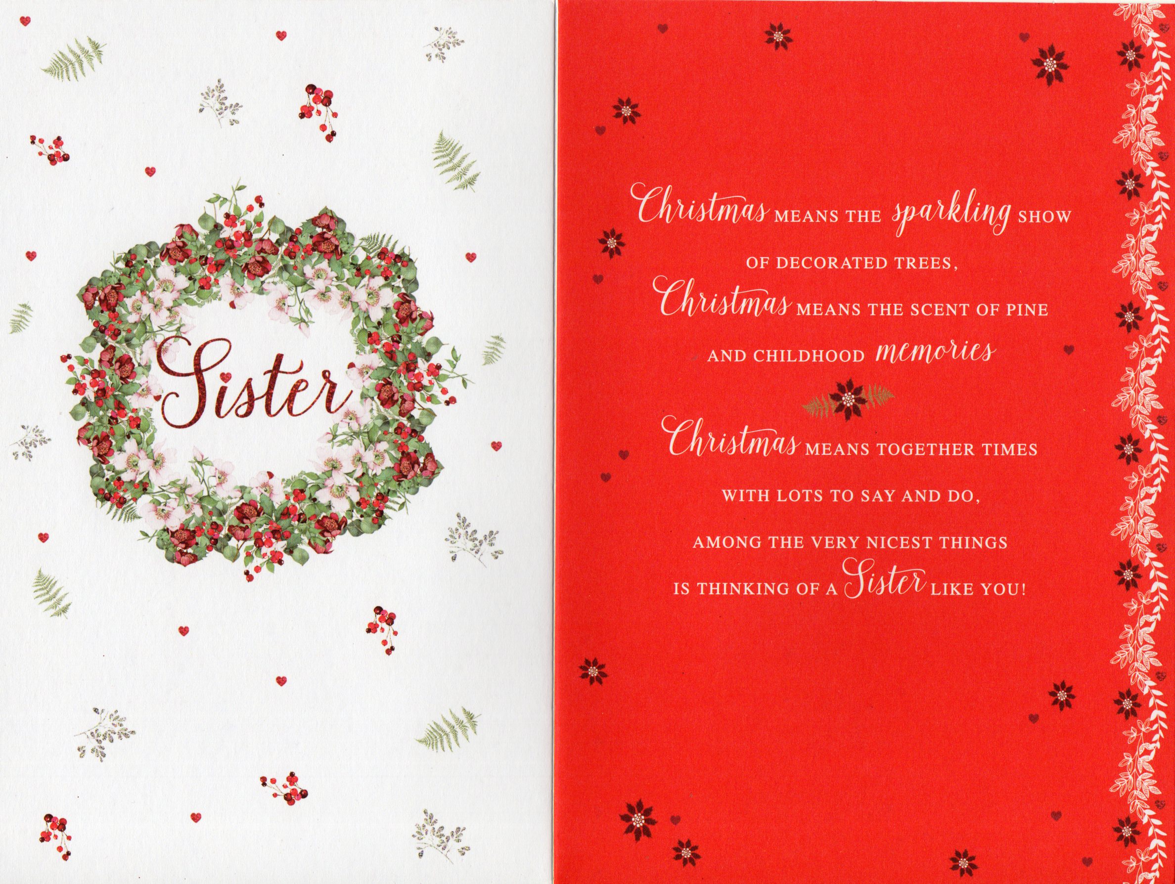Inside reads: Christmas means the sparkling show of decorated trees, Christmas means the scent of pine and childhood memorise Christmas means together times with lots to say and do, among the very nicest things is thinking of A Sister like you!