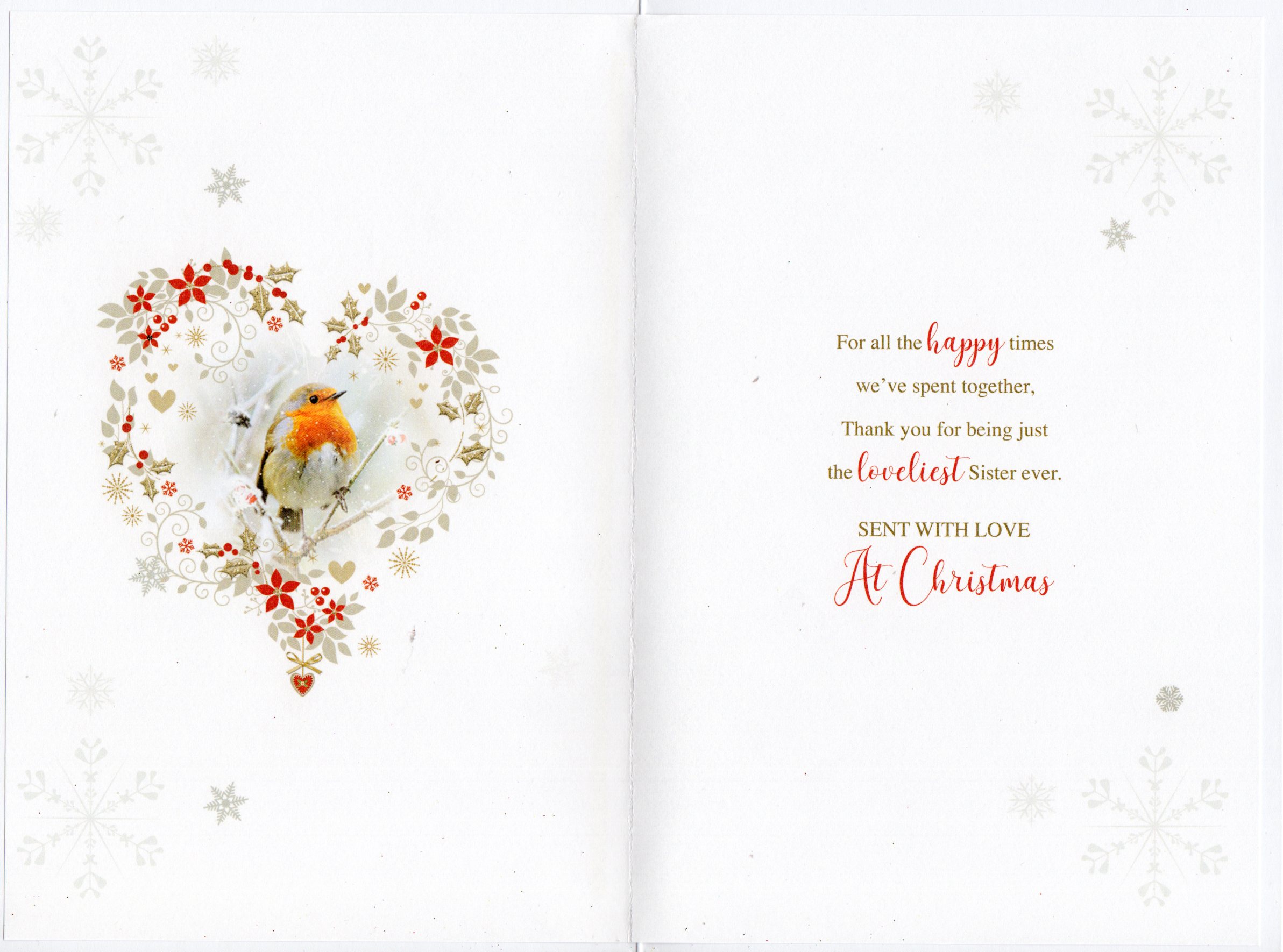 Inside reads: For all the happy times we've spent together, Thank you for being just the loveliest Sister ever. sent with love At Christmas