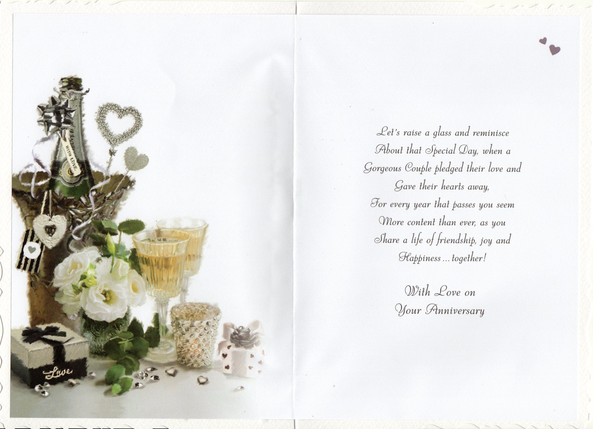 Inside reads: Let's raise a glass and reminisce About that Special Day, when a Gorgeous couple pledged their love and Gave their heart away, For every year that passes you seem More content than ever, as you share a life of Friendship, joy and Happiness... Together! With Love an Your Anniversary...