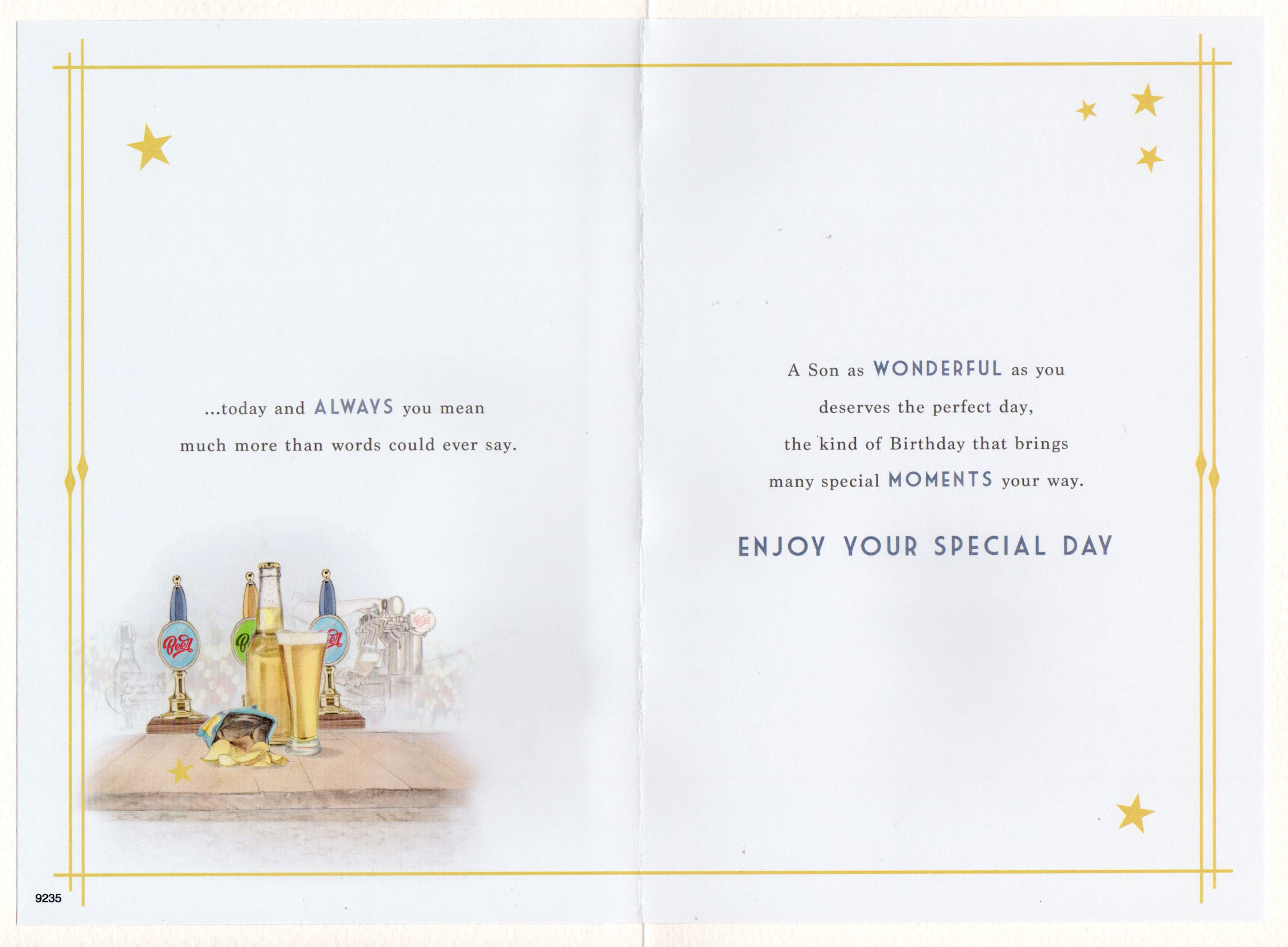Inside reads: ...today and Always you mean much more than words could ever say. A Son as Wonderful as you deserves the perfect day, the kind of Birthday that brings many special Moments your way. Enjoy Your Special Day