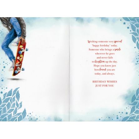 Inside reads: Wishing someone very special 'happy birthday' today. Someone who brings a smile where he goes and never fails to brighten up the day. Hope you know just how loved you are today, and always. Birthday Wishes Just For You