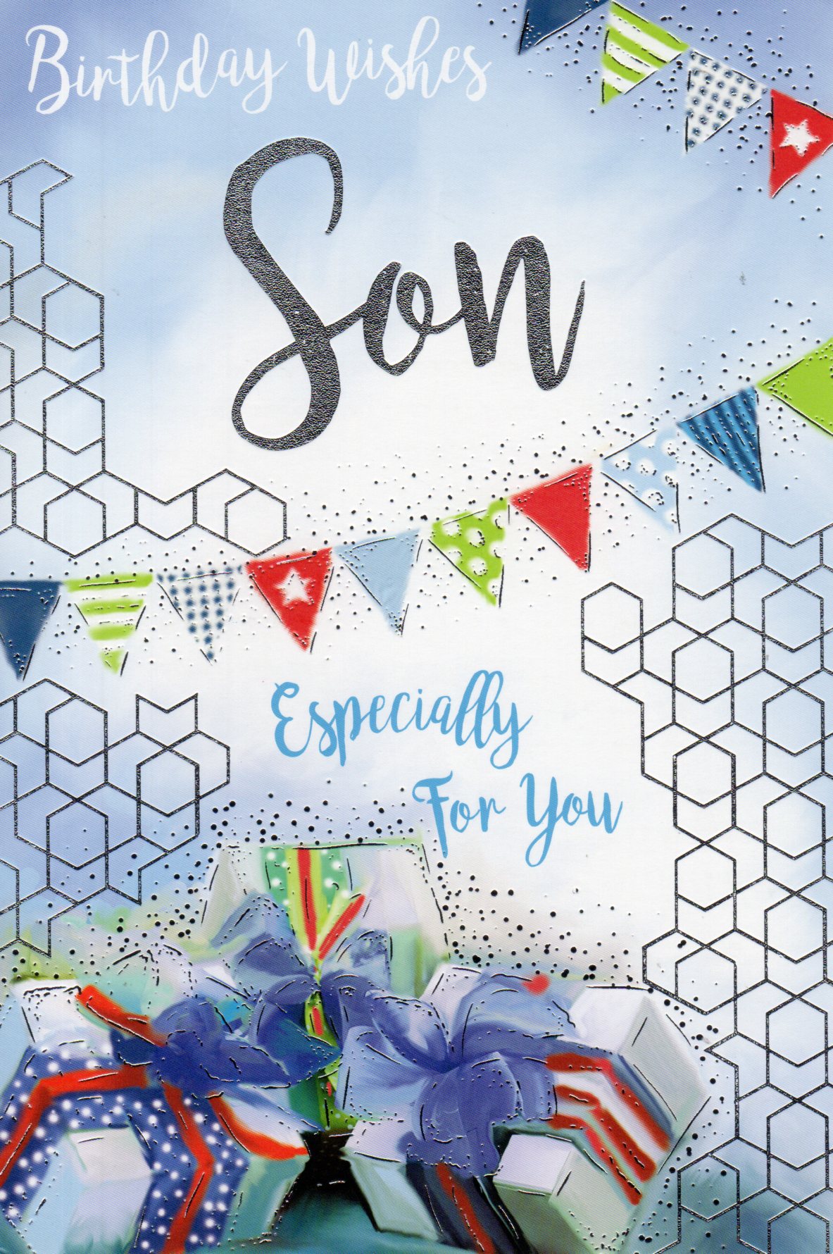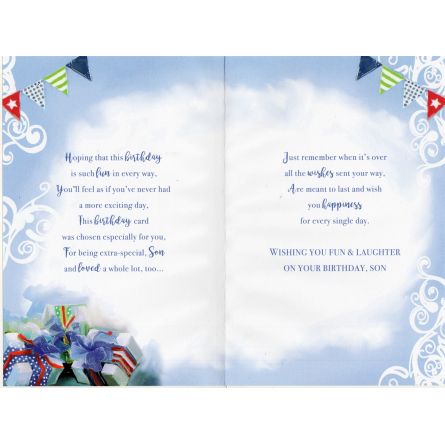 Inside reads: Hoping that this birthday is such fun in every way, You'll feel as if you've never had a more exciting day, This birthday card was chosen especially for you, For being extra-special, Son and Loved a whole lot, too..., Just remember when it's over all the wishes sent your way, Are meant to last and wish you happiness for every single day. Wishing You Fun & Laughter On Your Birthday, Son