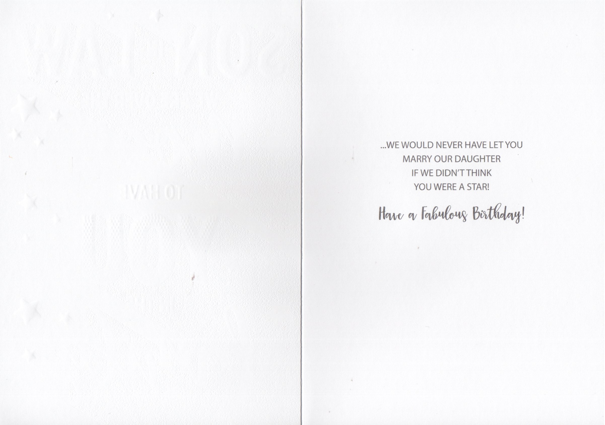 Inside reads: ...WE WOULD NEVER HAVE LET YOU MARRY OUR DAUGHTER IF WE DIDN'T THINK YOU WERE A STAR! Have a Fabulous Birthday!