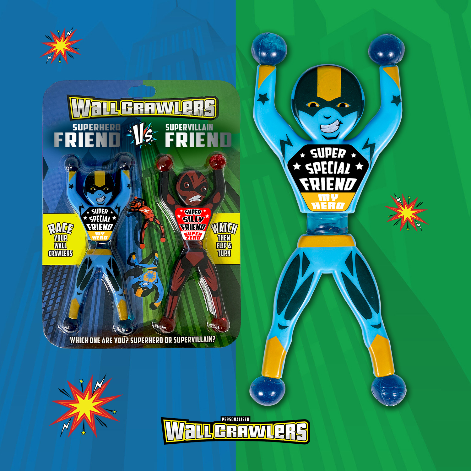 Throw your superhero and supervillain Wall Crawlers at a smooth vertical surface- try a wall, window or even bathroom tiles and see a super race in action!
