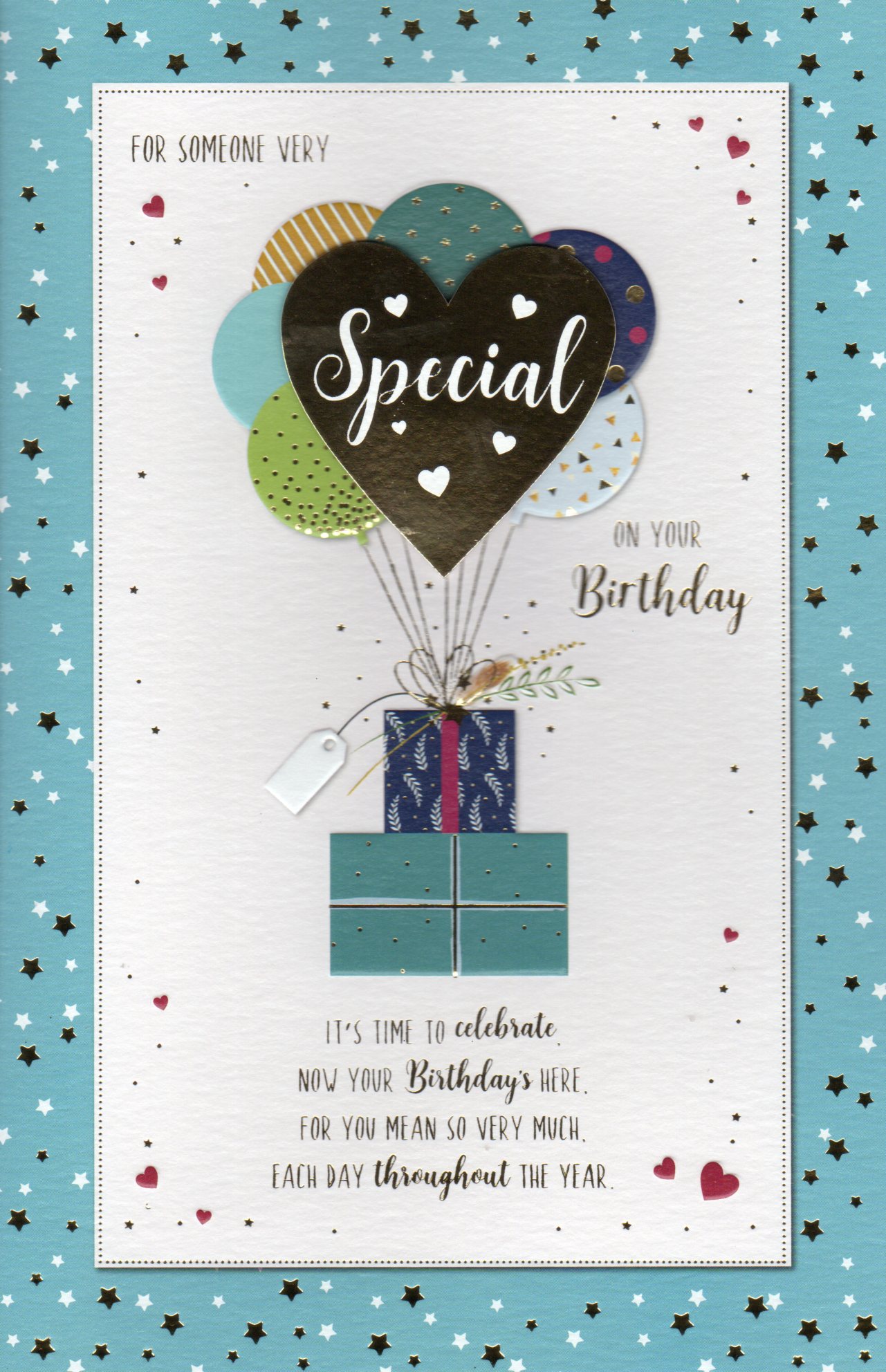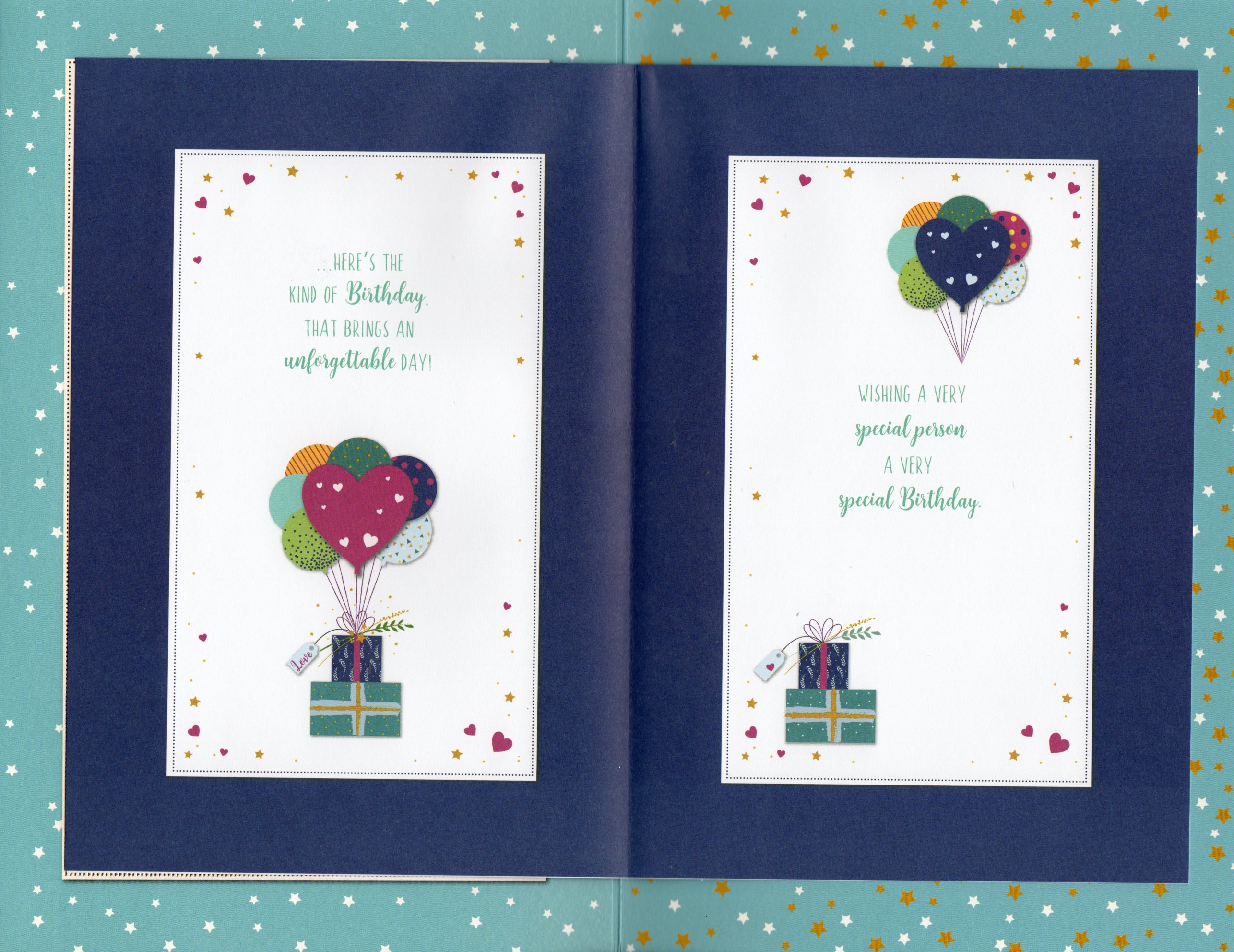 On the front the card reads: For Someone Very Special On Your Birthday It's Time To Celebrate Now Your Birthday's Here, For You Mean So Very Much. Each Day Throughout The Year.