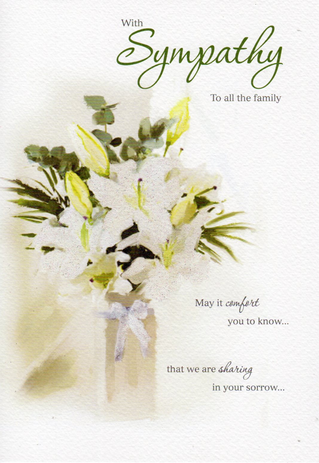 On the front the card reads: With Sympathy To all the family May it comfort you to know..., that we are sharing in your sorrow...