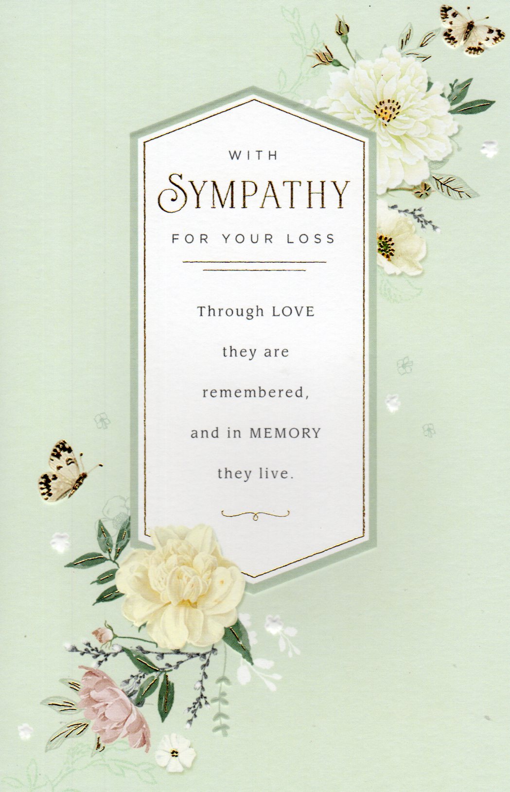 On the front the card reads: With Sympathy for your loss through love they are remembered, and in Memory they live.