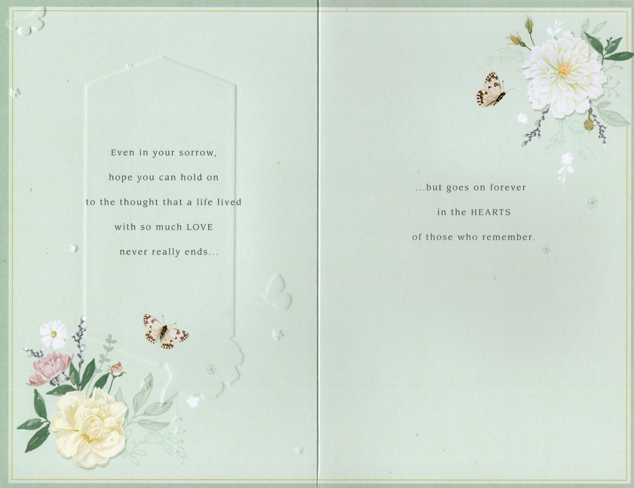 Inside reads: Even in your sorrow, hope you can hold on to the thought that a life lived with so much Love never really ends..., ...but goes on forever in the Hearts of those who remember.