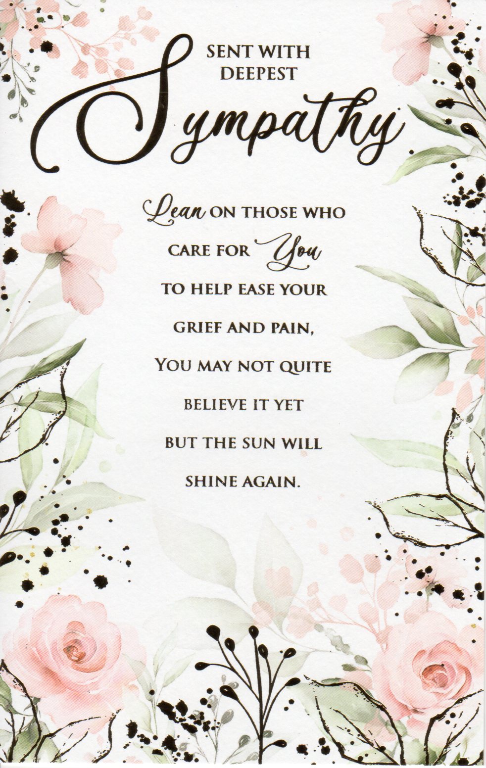On the front the card reads: Sent with Sympathy Learn on those who care for you to help ease your grief and pain, you may not quite believe it yet but the sun will shine again.