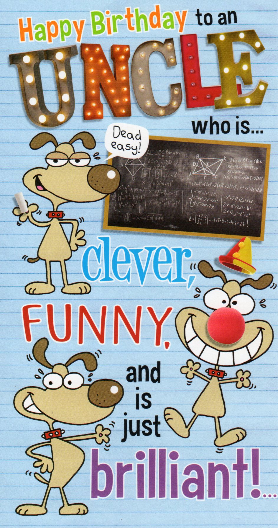 On the front the card reads: Happy Birthday to an UNCLE who is... Clever, Funny, and is just Brilliant!