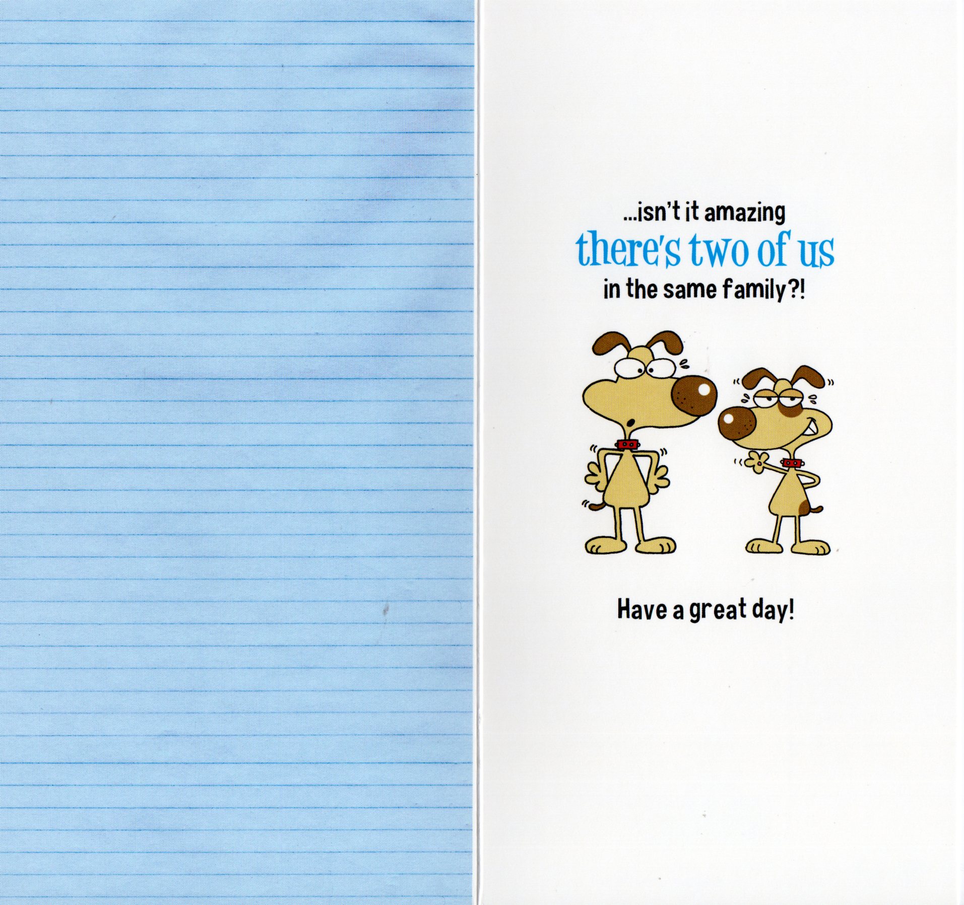 Inside reads: ...isn't it amazing there's two of us in the same family?! Have a great day!