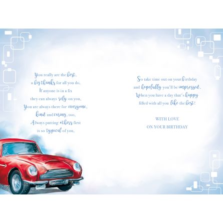 Inside reads: You really are the best, a big thanks for all you da, If anyone is in a fix they can always rely on you, You are always there for everyone, kind and caring, too, Always putting others first is so typical of you, So take time out on your birthday and hopefully you'll be impressed, when you have a day that's happy filled with all you like the best! With Love On Your Birthday