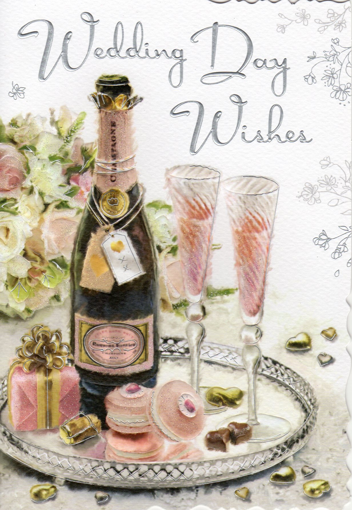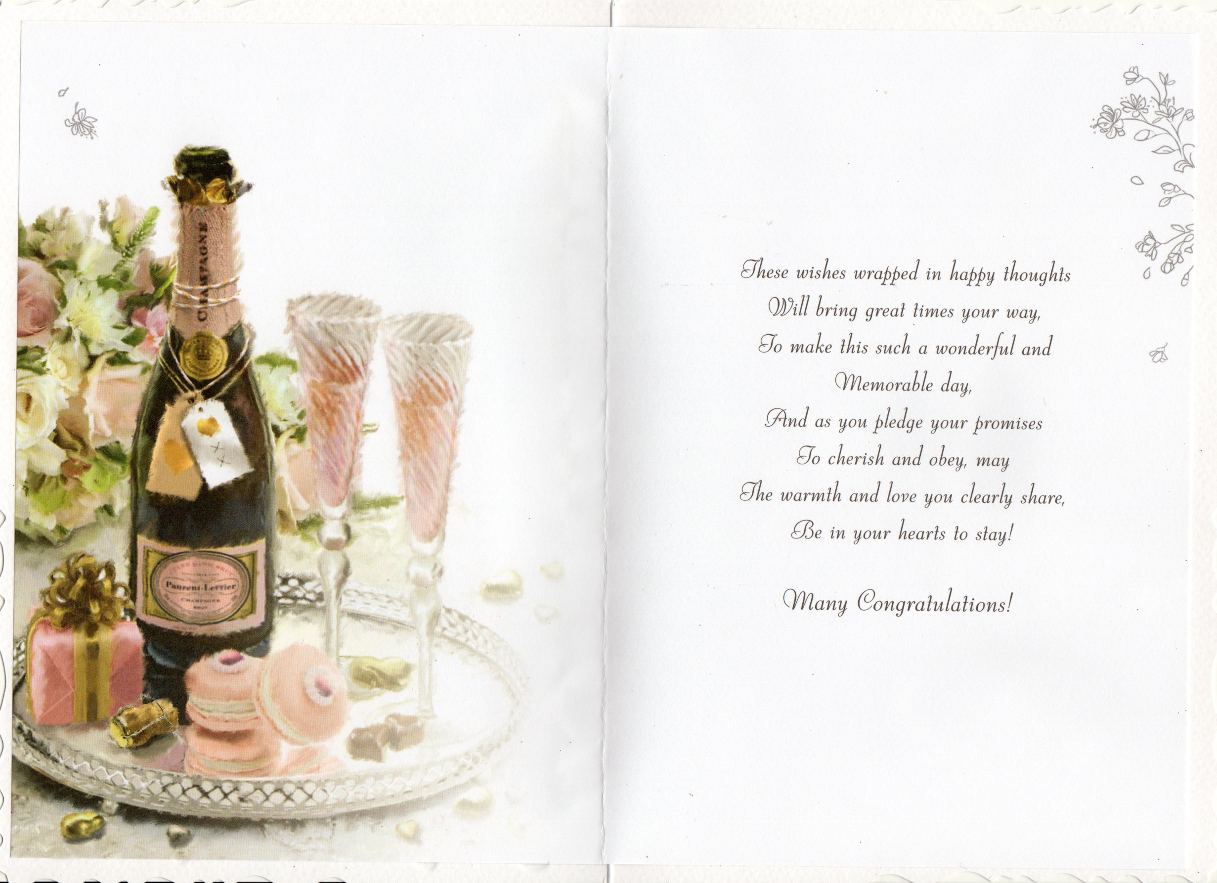 Inside reads: These wishes wrapped in happy thoughts will bring great times your way, To make this such a wonderful and memorable day, And as you pledge your promises to cherish and obey, may the Warmth and love you clearly share, Be in your hearts to stay! Many Congratulations!
