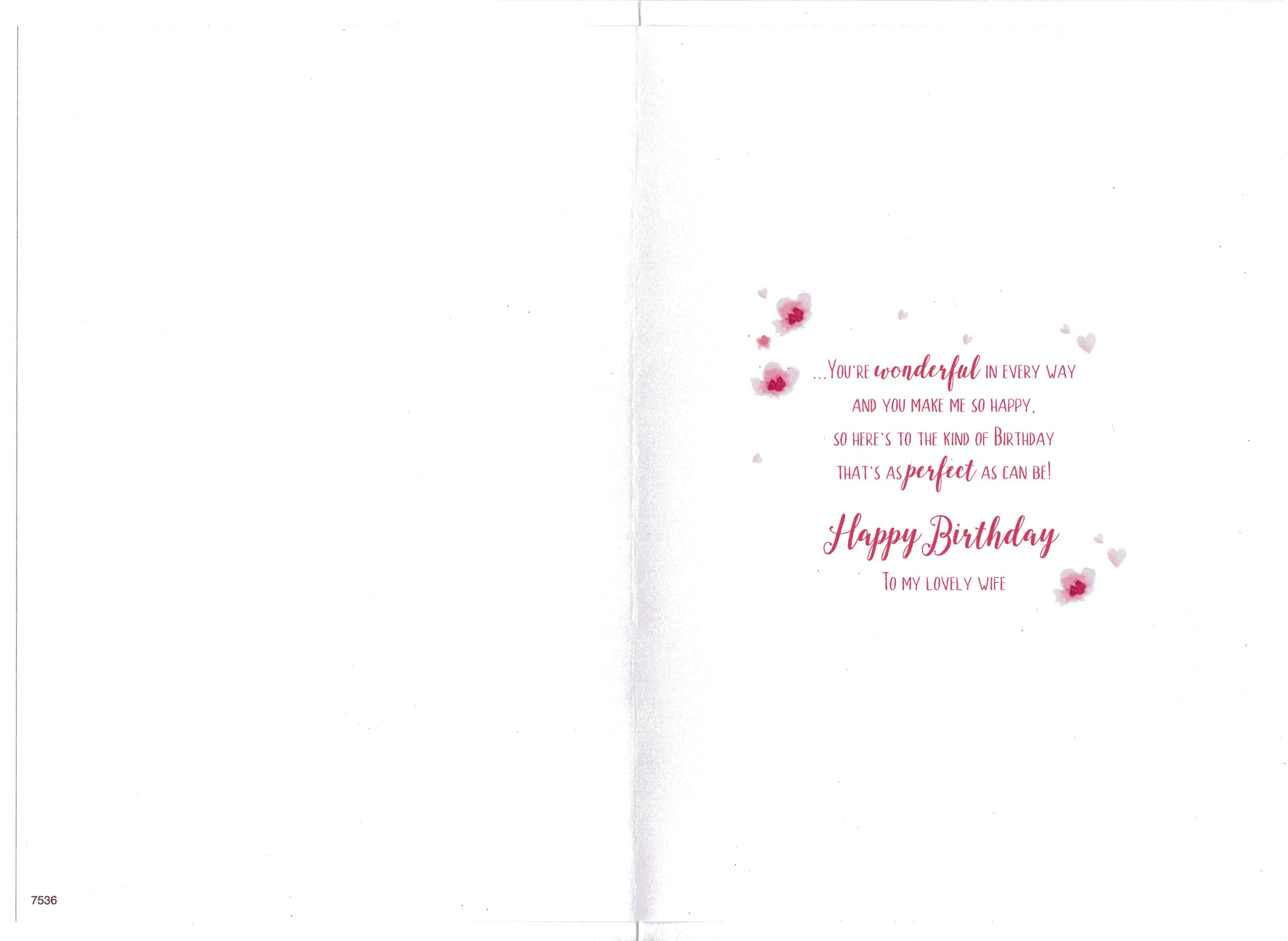 * Inside reads: ...You're wonderful in every way and you make me so happy, So here's to the kind of Birthday that's as perfect as can be! Happy Birthday To My Lovely Wife.