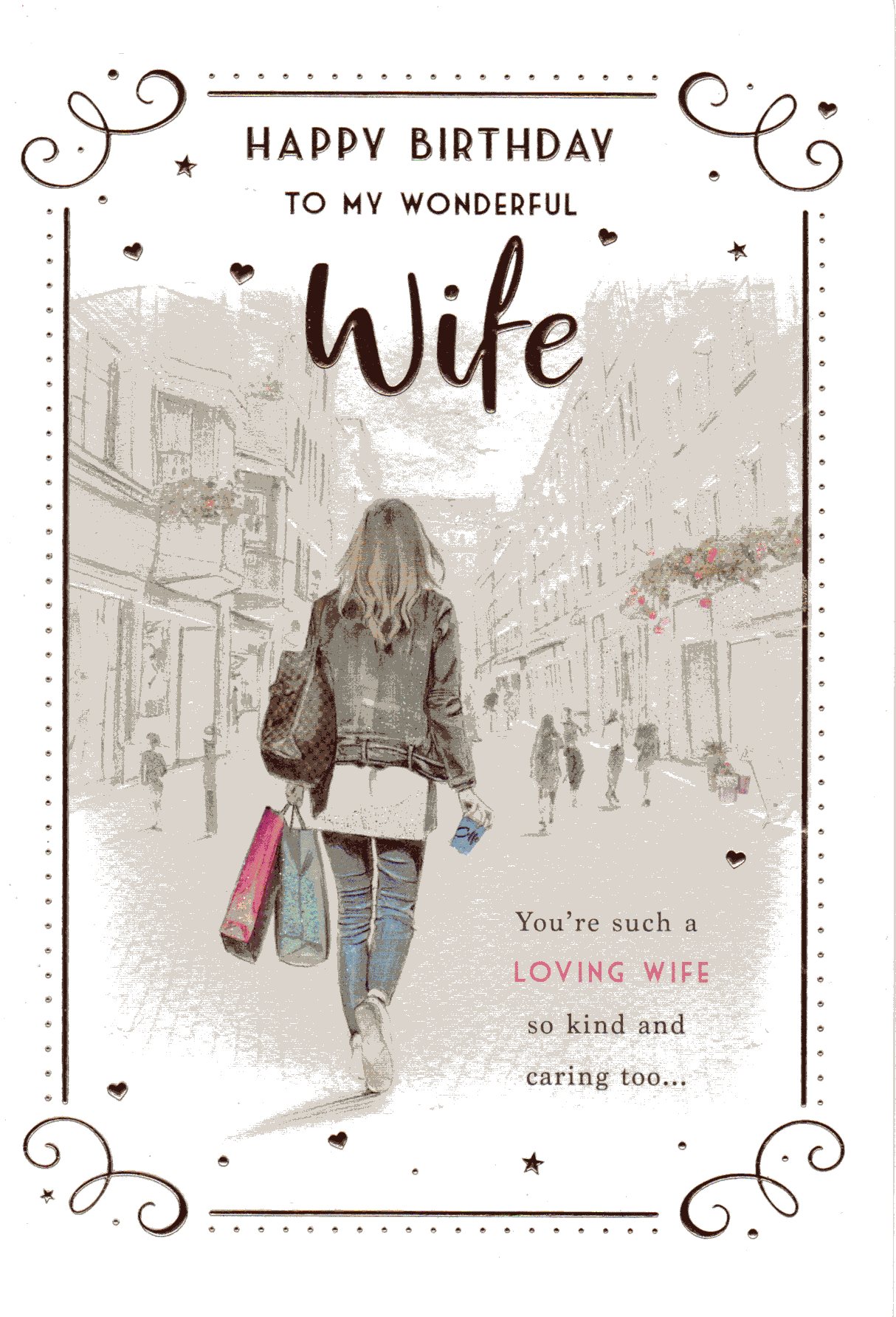 On the front the card reads: Happy Birthday To my wonderful Wife You're such a Loving Wife so kind and caring too...