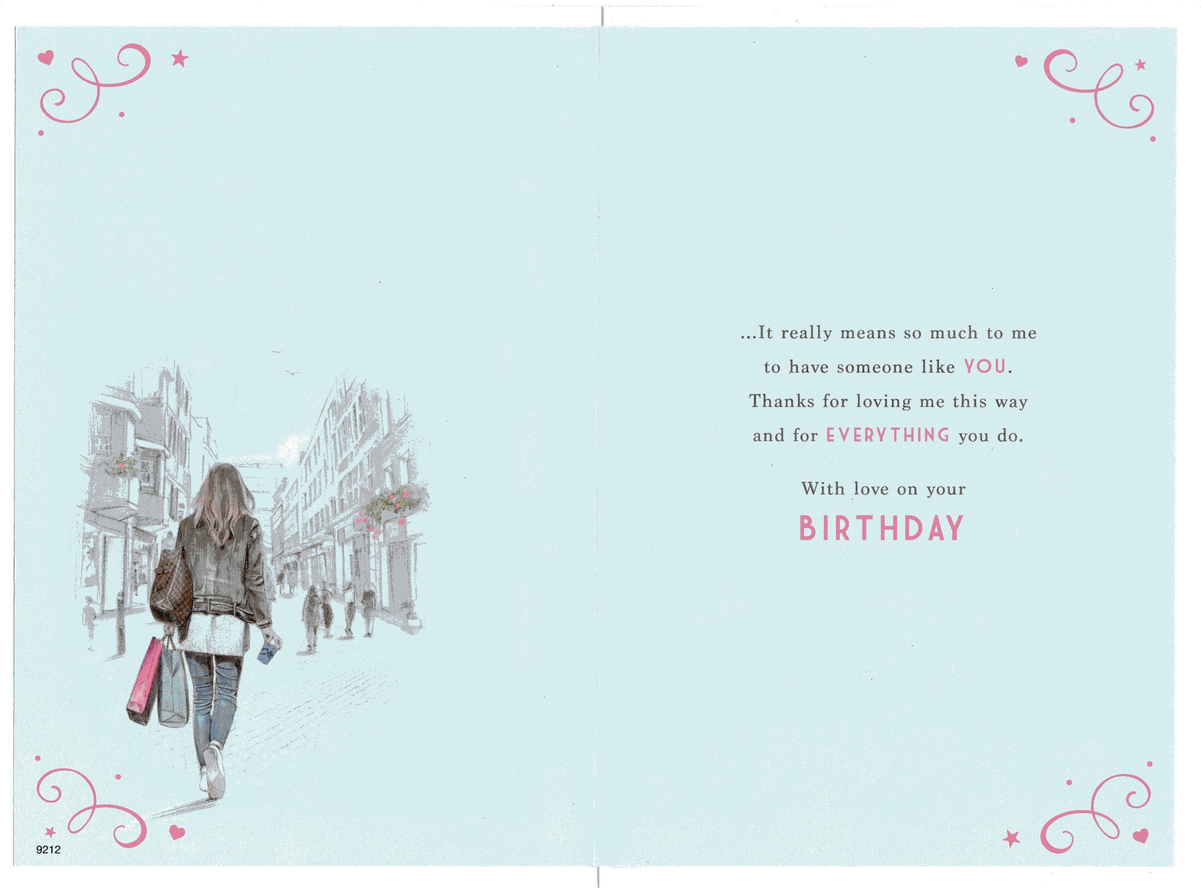 Inside reads: ...It really means so much to me to have someone like You. Thanks for loving me this way and for Everything you do. With love on your Birthday.