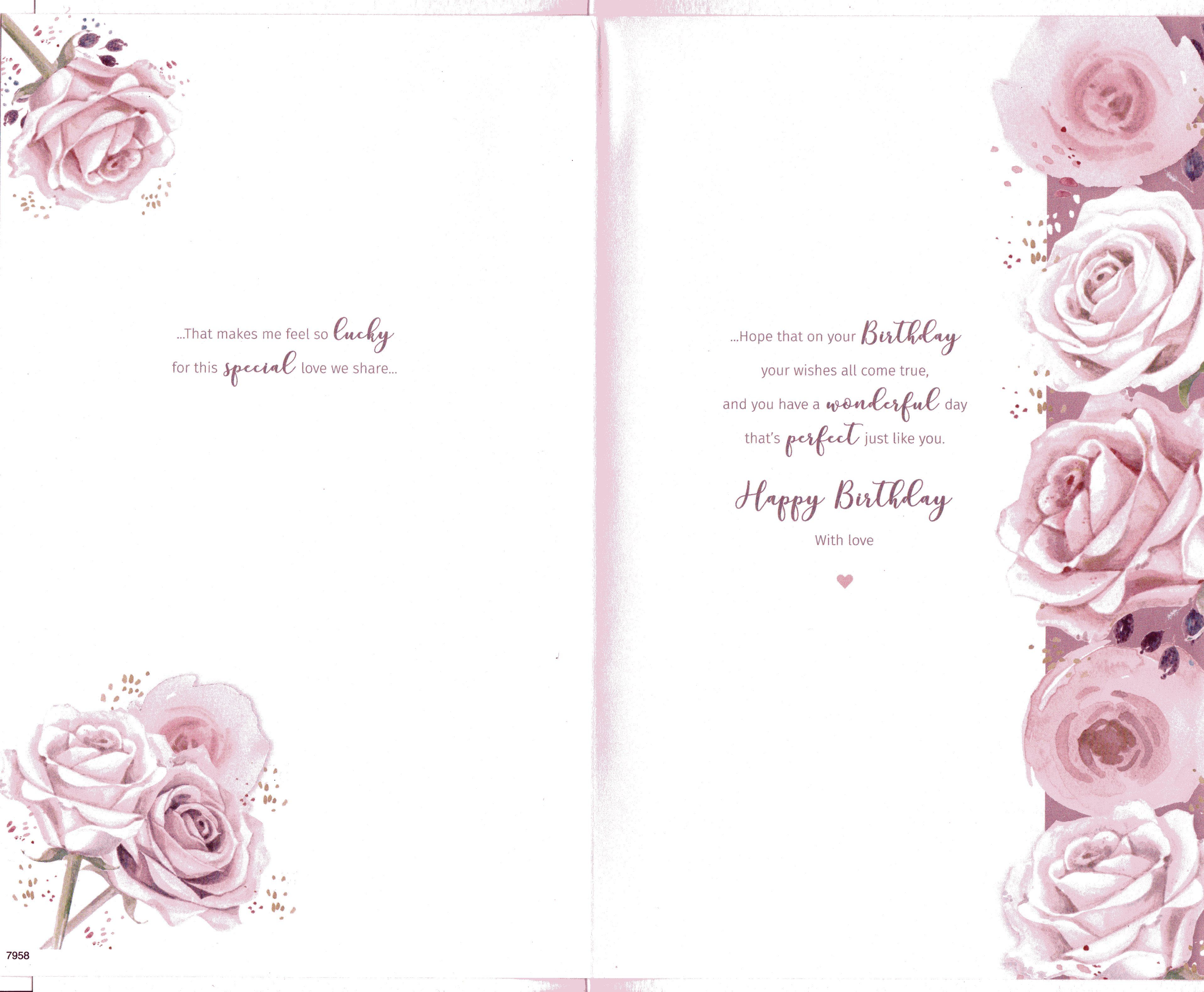 On the front the card reads: Birthday wishes for my wonderful Wife on your Birthday this message comes with all my love and lots of kiss too, to say how much it means to have a Wife as special as you...