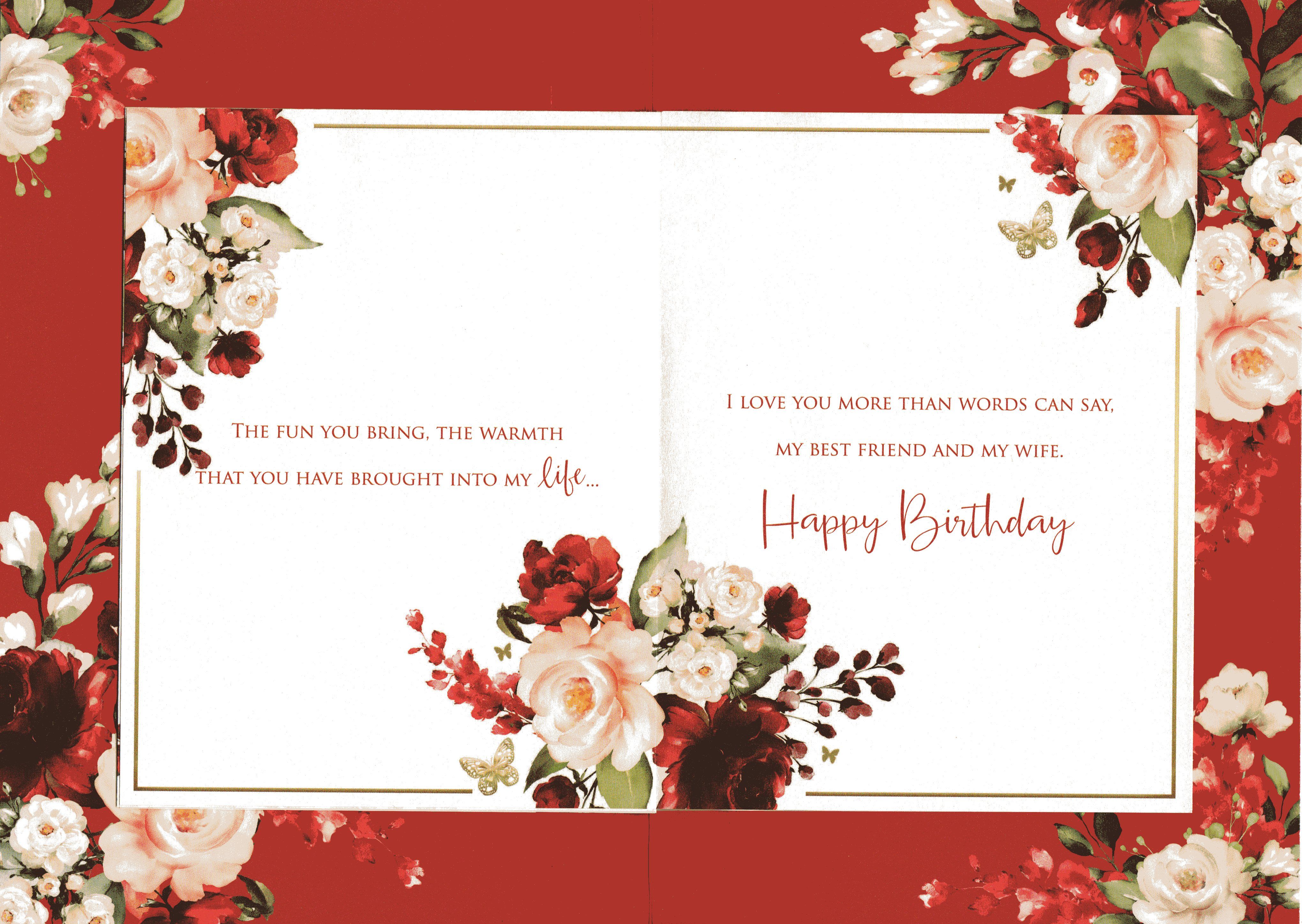 On the front the card reads: Birthday wishes for my wonderful Wife on your Birthday this message comes with all my love and lots of kiss too, to say how much it means to have a Wife as special as you...