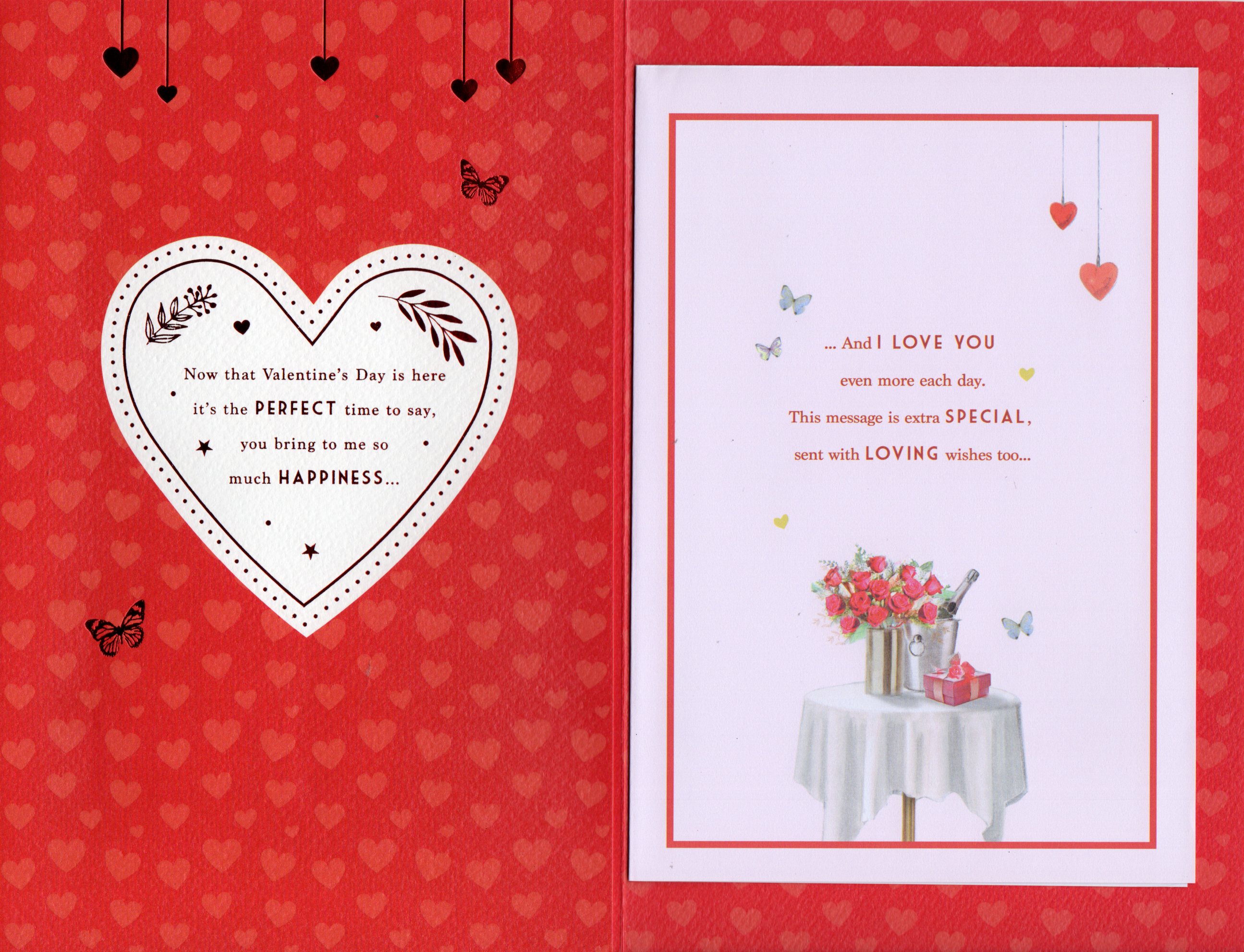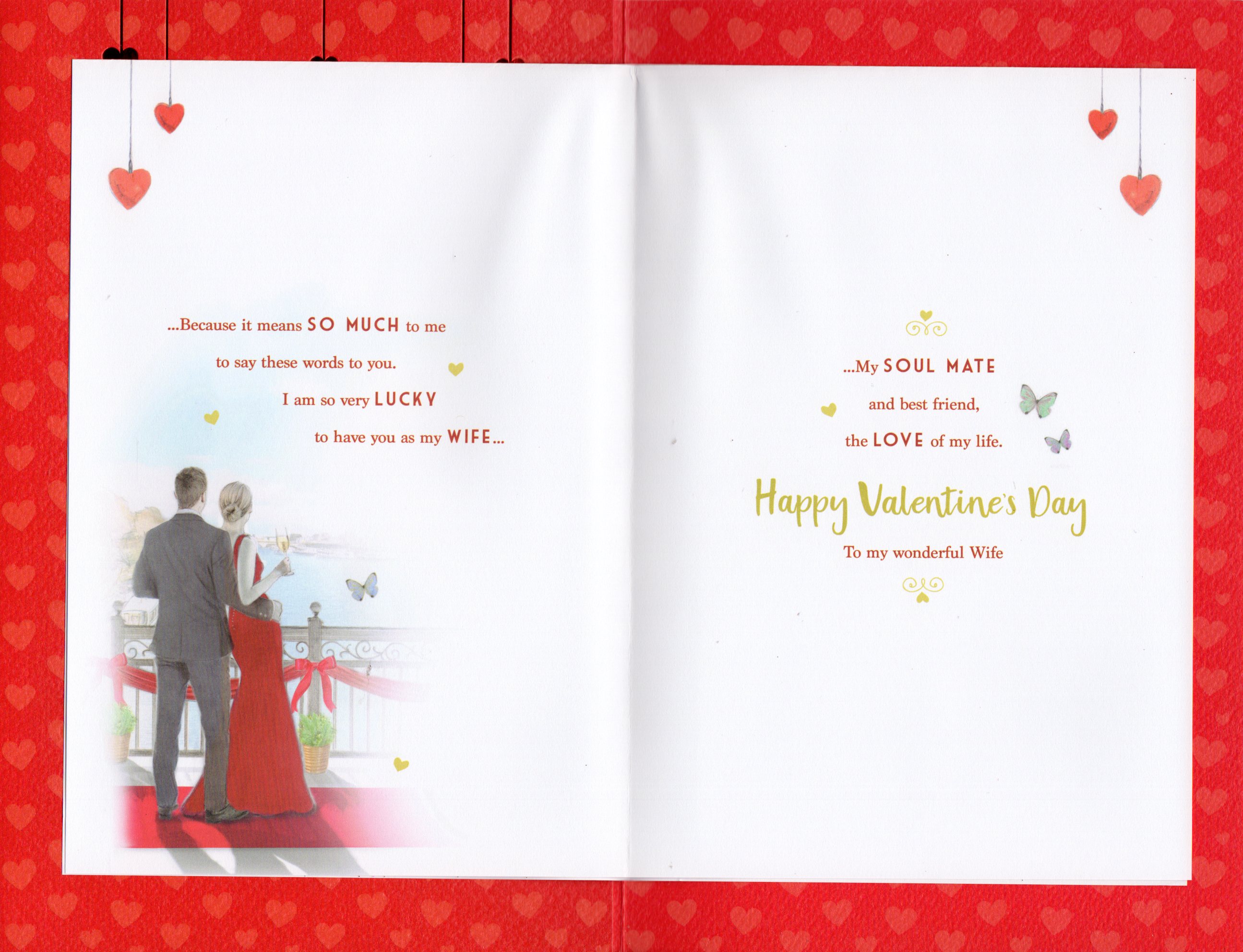 Inside reads: page l ...And I Love You even more each day. This message is extra Special, sent with Loving wishes too... page ll ...Because it means So Much to me to say these words to you. I am so very Lucky to have you as my Wife page lll ...My Soul Mate and best friend, the Love of my life. Happy Valentine's Day To my wonderful Wife
