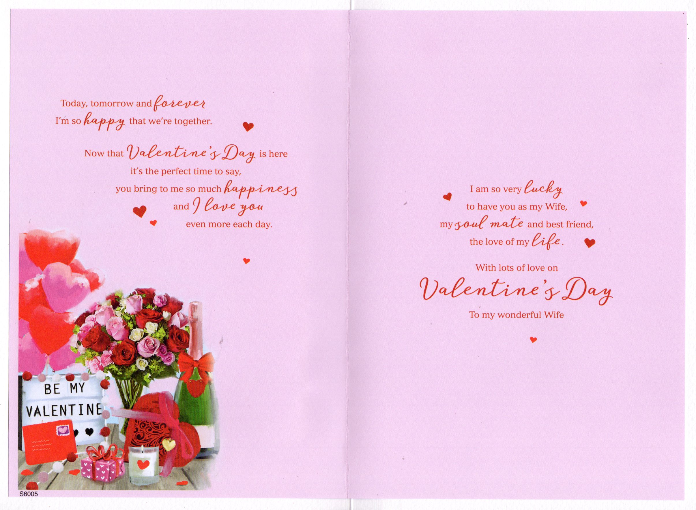 Inside reads: Today, tomorrow and forever I'm so Happy that we're together. Now that Valentine's Day is here it's the perfect time to say, you bring to me so much happiness and I Love You even more each day. I am so very lucky to have you as my Wife, my Soul mate and best friend, the love of my Life. with lots of love on Valentine's Day To my wonderful Wife