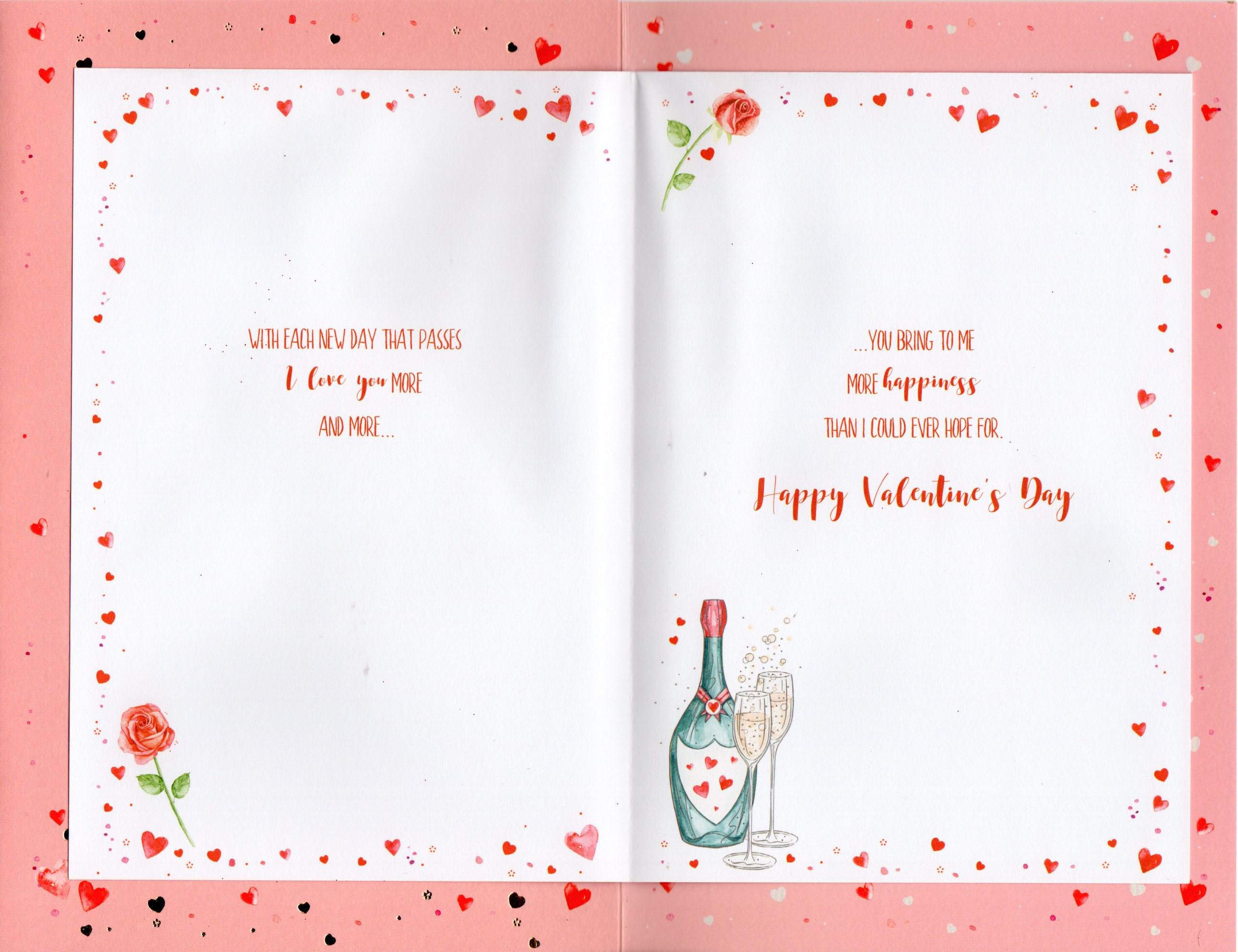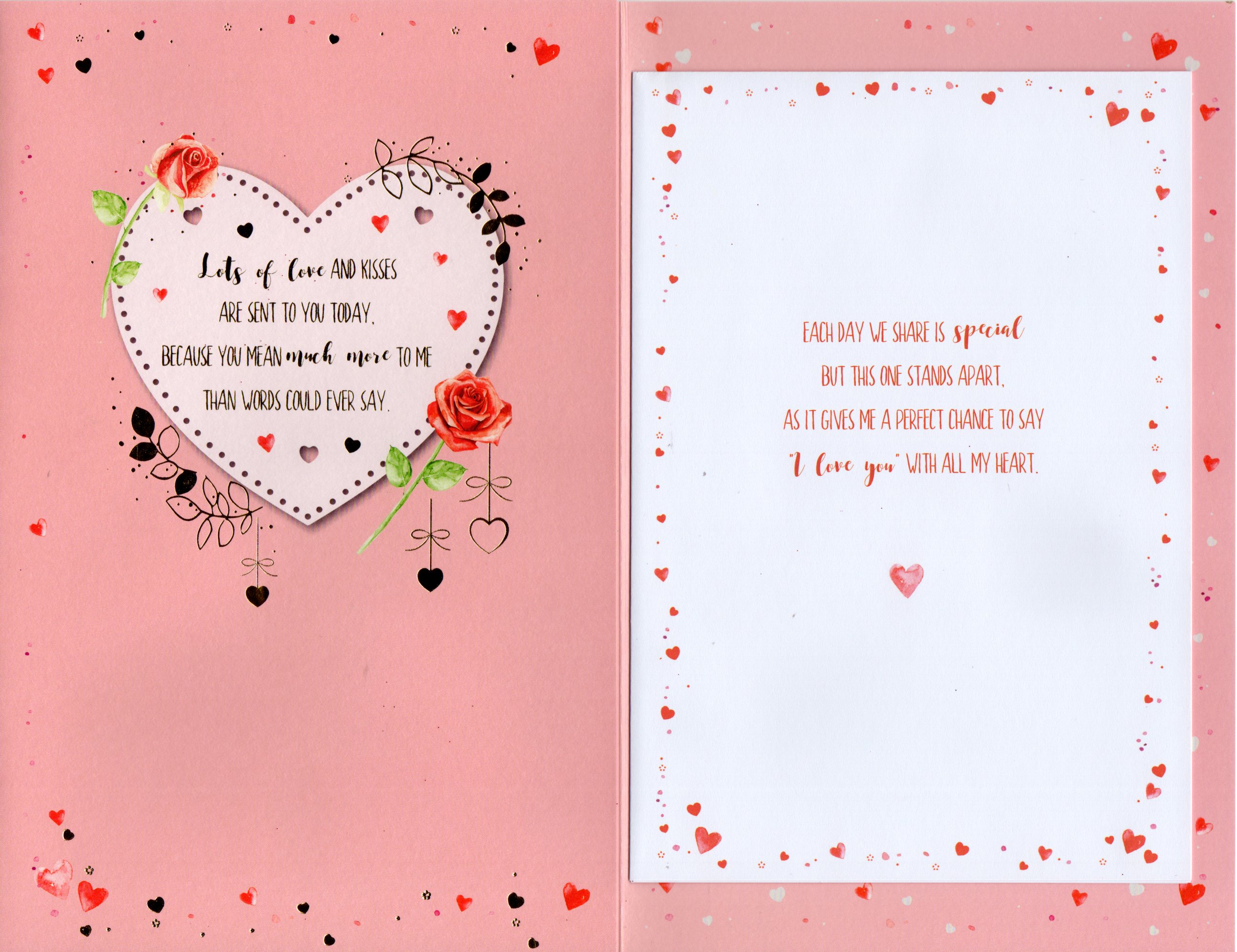 Inside reads: pagel Lets of love and kisses are sent to you today. Because you mean much mere to me than words could every say. pagell Each we share is special but this one stands apart, as it gives me a perfect chance to say ''I love You'' with all my heart. pagelll with each new day that passes I Love You more and more..., ...You bring to me more happiness than I could ever hope for. Happy Valentine's Day